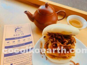 5種類のバオの中から、今回は定番のClassic(クラシック)を注文。ホロホロに煮込まれた豚の角煮は、ピーナッツパウダーとパクチーの香りが効いていて食欲をそそります。急須で入れた台湾茶と一緒に♡
