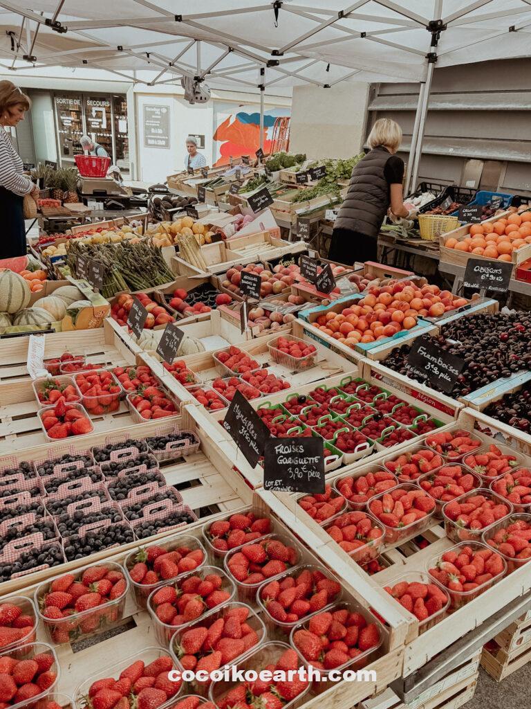 朝7:30から昼14:00まで営業しているこのマルシェでは、野菜・魚・ハムなど毎日新鮮な地元の食材が並びます。