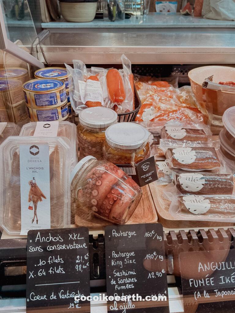 生鮮食品だけでなく、タコや唐辛子の瓶詰めなど、バスク地方ならではの食材もたくさん!
