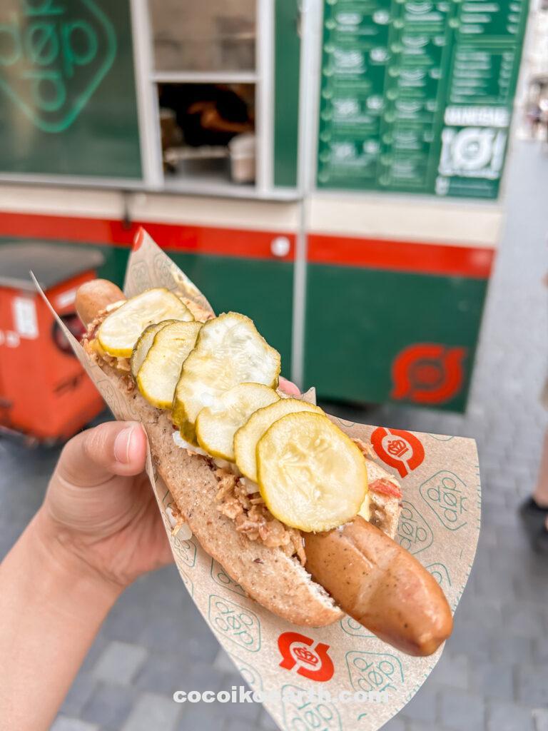デンマークのホットドックは、カリカリの玉ねぎとピクルスがたっぷり乗っているのが特徴です。