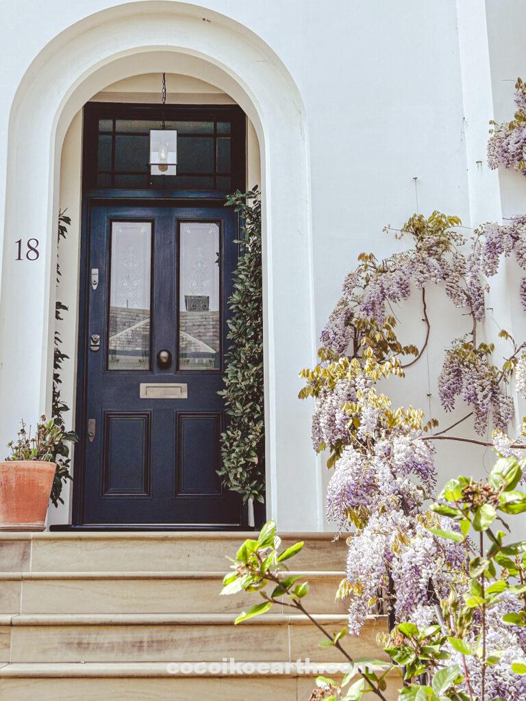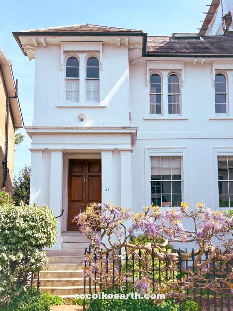 Gloucester Road駅から徒歩6分ほどの距離にある高級住宅街では、玄関先や壁に沿って美しく整えられた藤の花をたくさん見かけます。