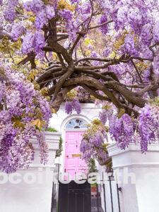 先ほどのBedford Gardenから歩いて2分ほどの距離、地下鉄Notting Hill Gate駅へ向かう途中にあるこの通りでは、水色の壁に紫の花が美しい藤の木を見ることができます。