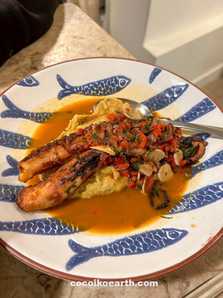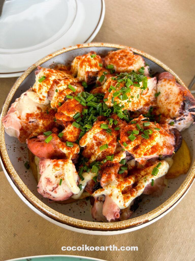 茹でたタコにニンニクや塩、オリーブオイルを加えてオーブンで焼き上げ、添え物にジャガイモなどを加えたシンプルな料理。