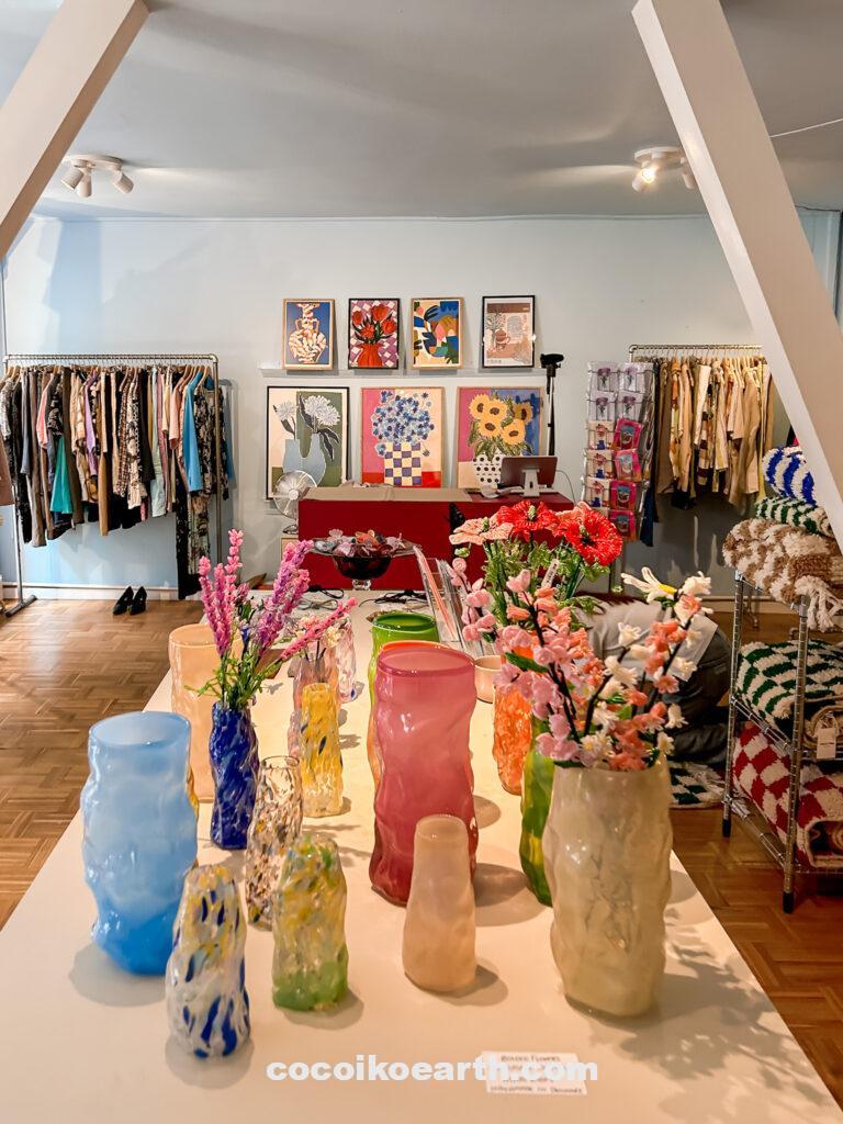 カラフルな花瓶からハンドペイントのマグカップ、ビンテージのお洋服まで、小さな店内にはセンス抜群のオーナーがセレクトしてきた商品が並びます。