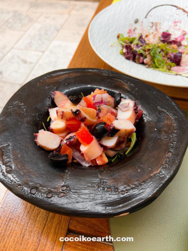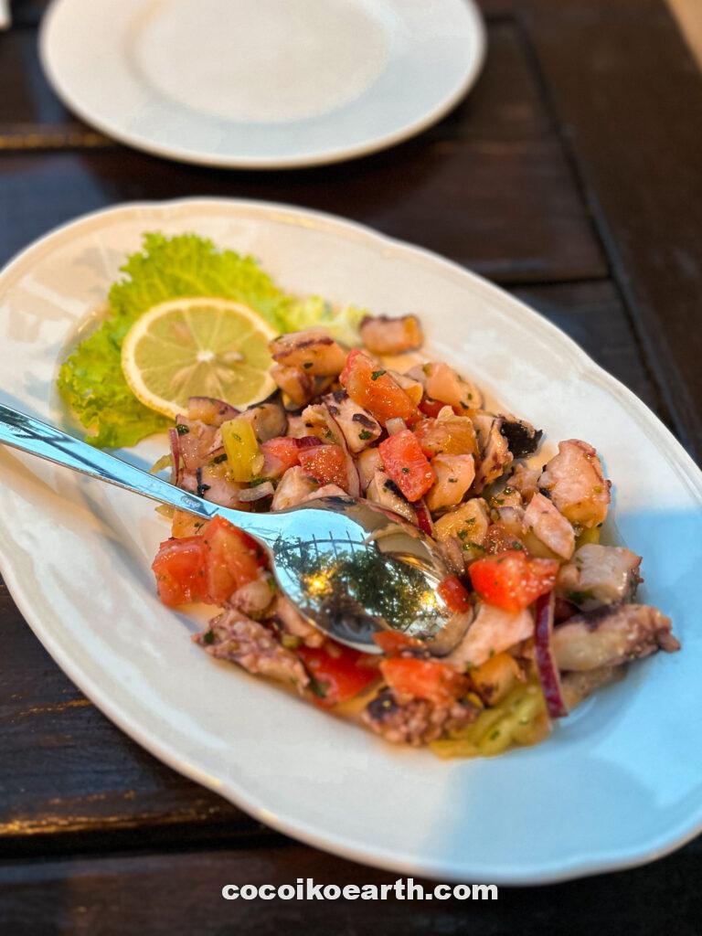 そんなダルマチア料理で定番の前菜といえば、タコサラダ!タコを湯通ししてマリネし、玉ねぎ・オリーブ・トマト等と合わせて、サラダとして食べます。