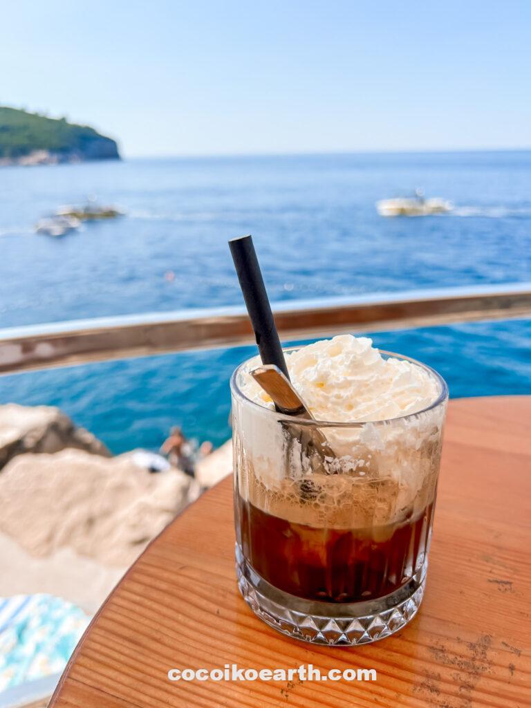 旧市街を囲う城壁の外側、海面ギリギリの岩の上に立っているカフェ・バーで、目下にアドリア海を眺めながら、コーヒーやお酒を楽しむことができるんです。
